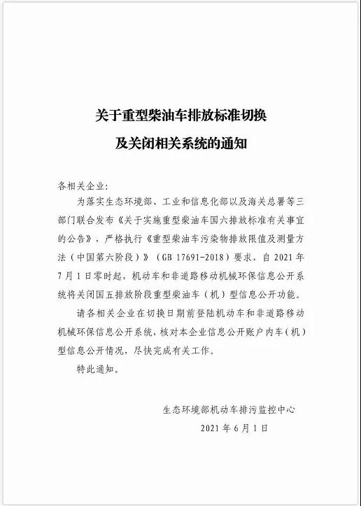 為落實(shí)生態(tài)環(huán)境部、工業(yè)和信息部以及海關(guān)總署等三部門聯(lián)合發(fā)《關(guān)于實(shí)施重型柴油車國(guó)六排放標(biāo)準(zhǔn)有關(guān)事宜的公告》,嚴(yán)格執(zhí)行《重型柴油車國(guó)六排放標(biāo)準(zhǔn)有關(guān)事宜的公告》,嚴(yán)格執(zhí)行《重型柴油車污染物排放限值及測(cè)量方法(中國(guó)第六階段)》(GB 17691-2018)要求,自2021年7月1日零時(shí)起,機(jī)動(dòng)車和非道路移動(dòng)機(jī)械環(huán)保信息公開(kāi)系統(tǒng)將關(guān)閉國(guó)五排放階段重型柴油機(jī)車(機(jī))型信息公開(kāi)功能。